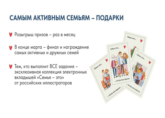 Для семей-участниц организаторы подготовили множество подарков. Розыгрыш призов будет проводиться раз в месяц. А в конце марта пройдет финал и награждение самых активных и дружных семей. Будет разыграно 100 семейных путевок по России. Кроме того, те, кто выполнит ВСЕ задания, смогут собрать эксклюзивную коллекцию электронных вкладышей «Семья – это», которую нарисовали специально для проекта российские художники-иллюстраторы.